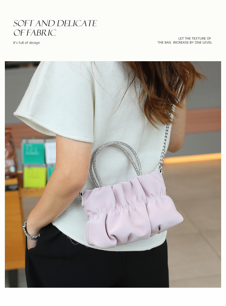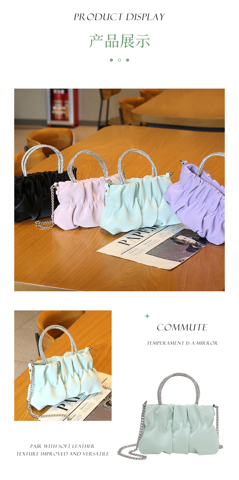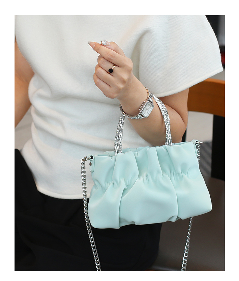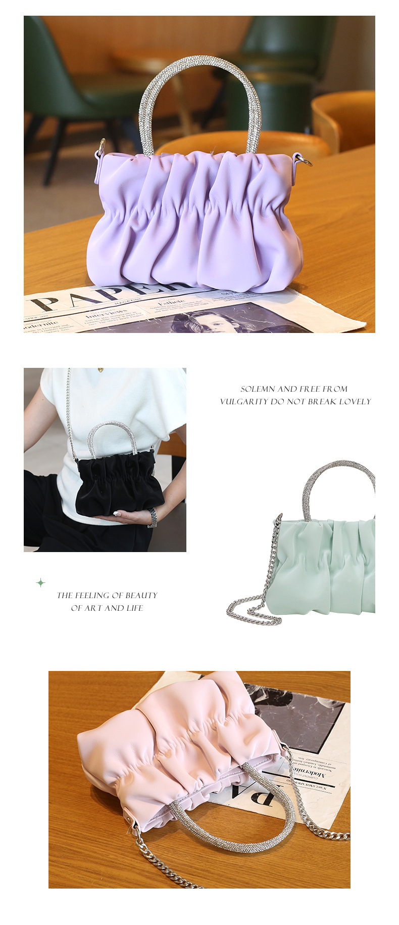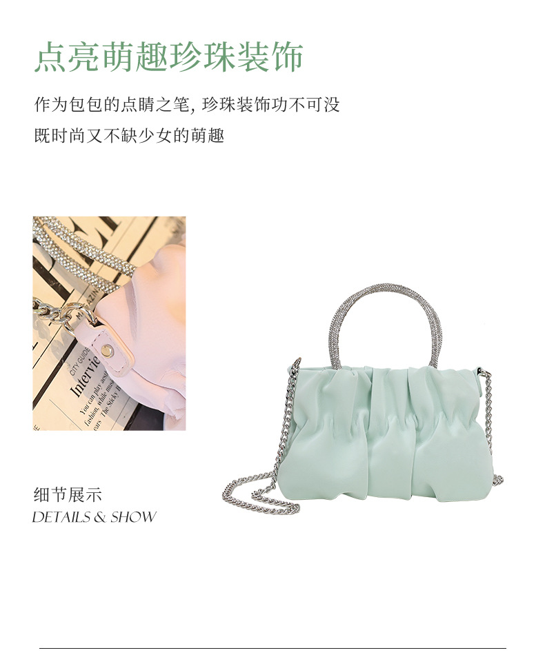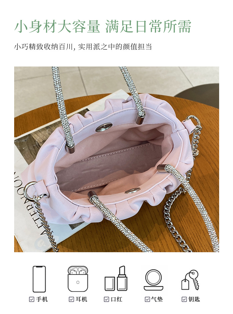 新款马卡龙色潮流可爱水钻手提包高级褶皱斜挎包链条包