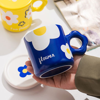 夏日之花陶瓷杯可爱马克杯带盖情侣水杯 女杯子设计感ins 风咖啡杯