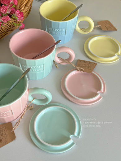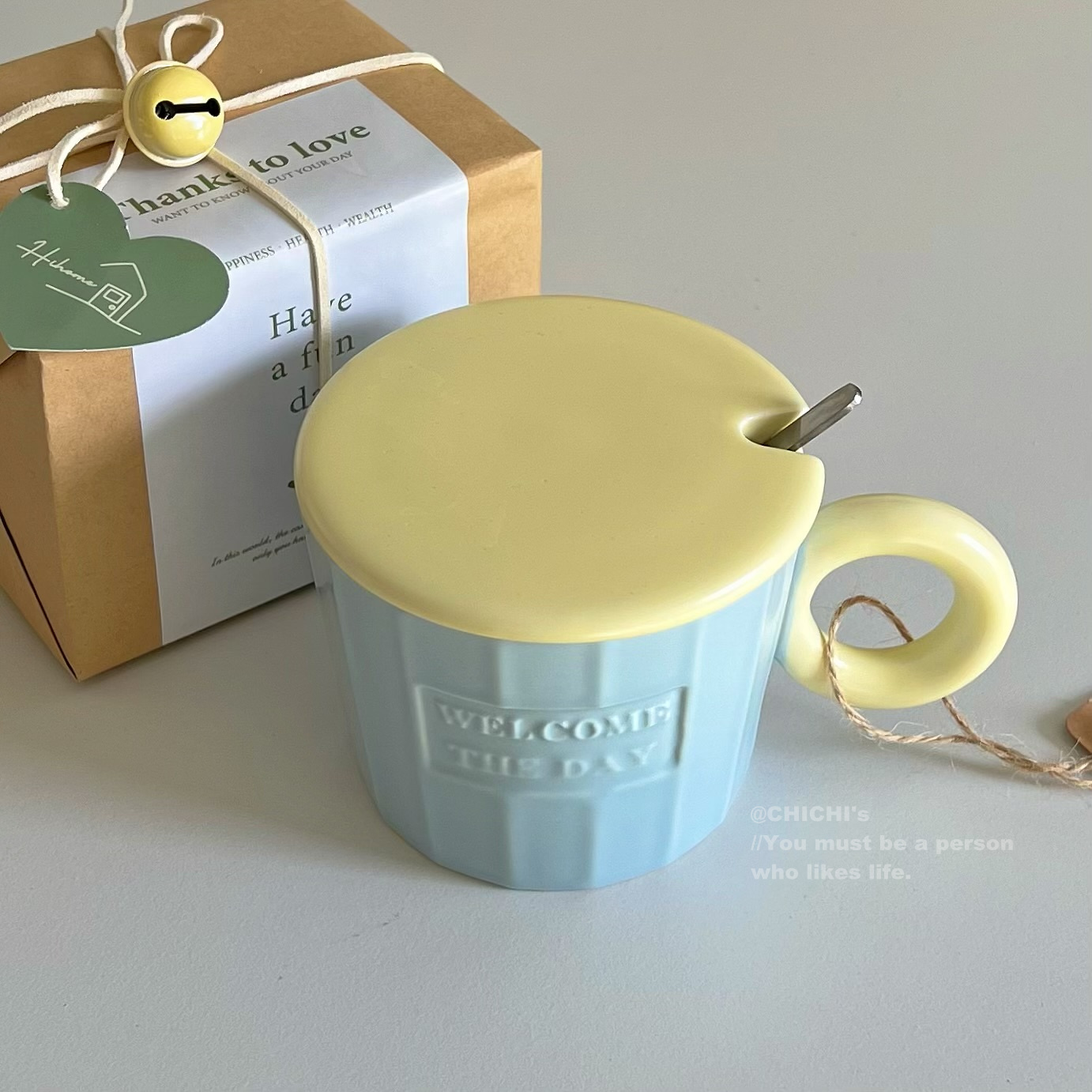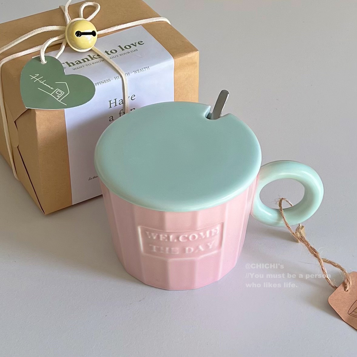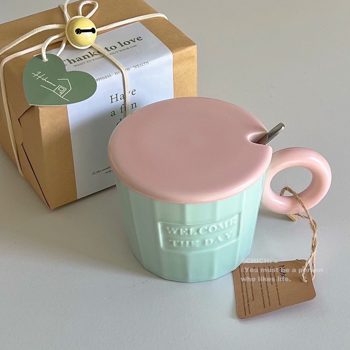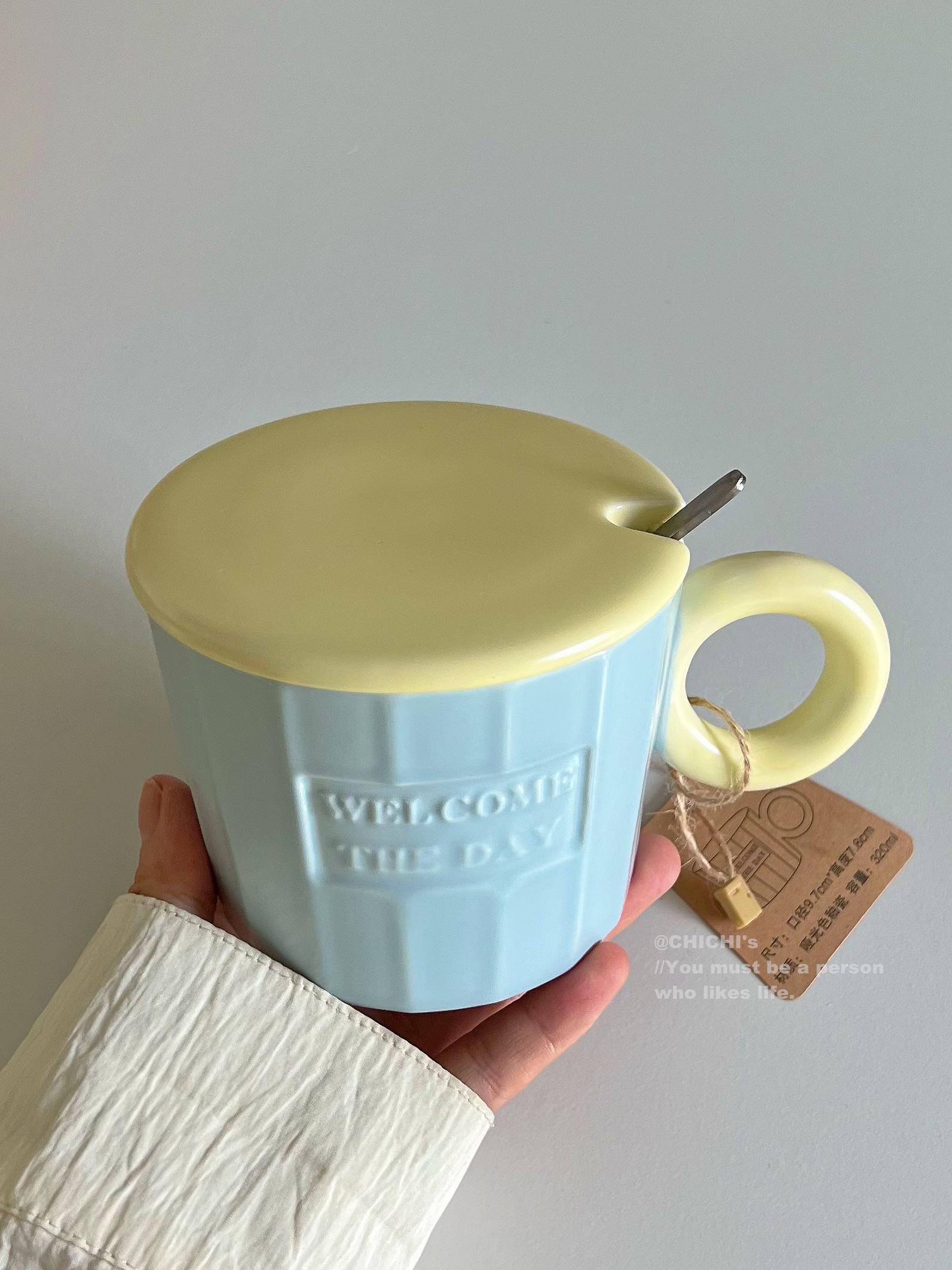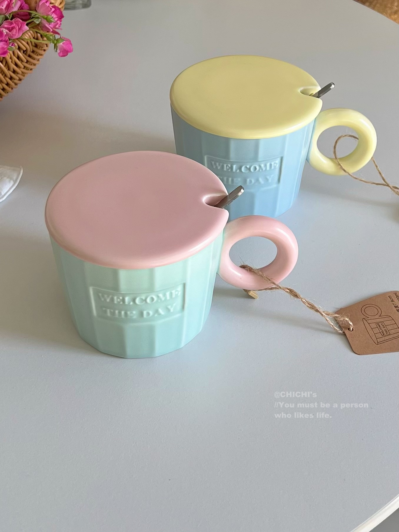 4JSHins风多巴胺风清新彩色撞色带盖勺陶瓷马克杯釉下彩耐高温咖