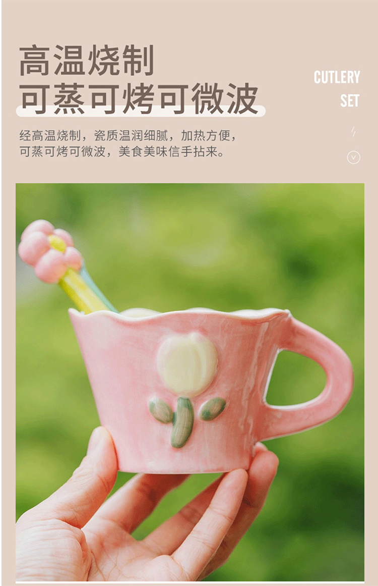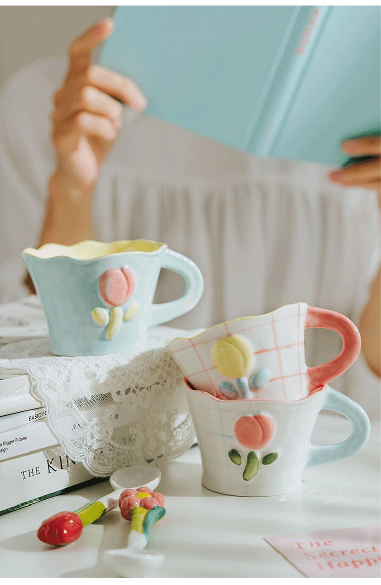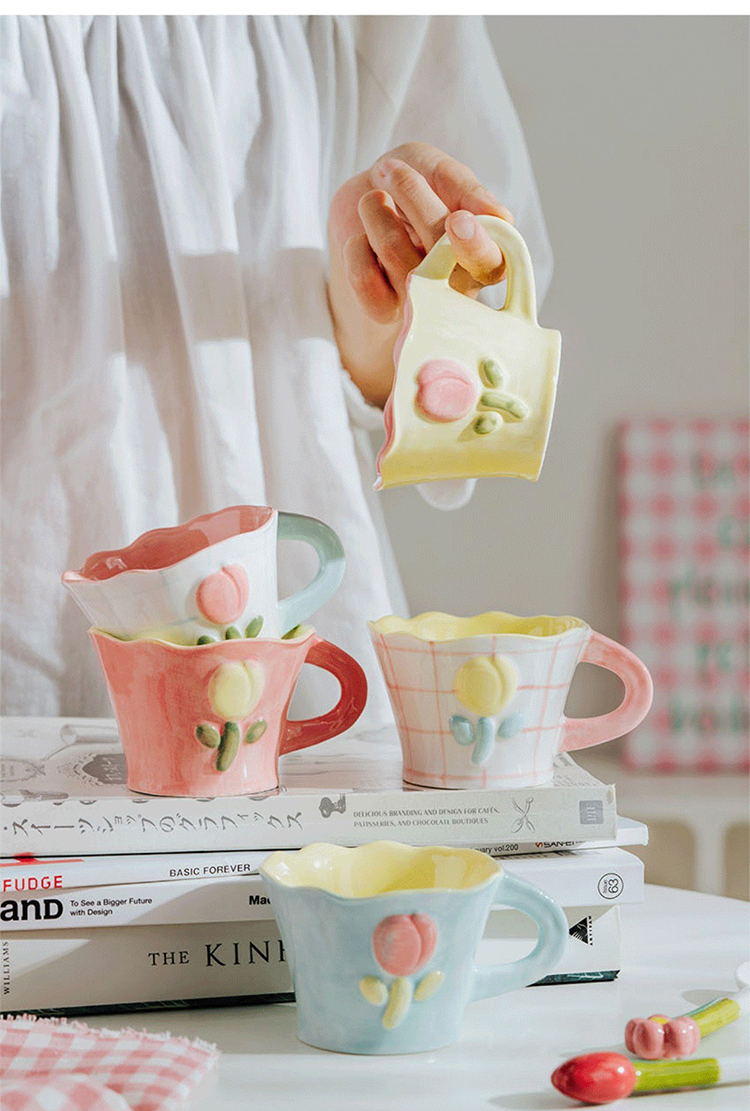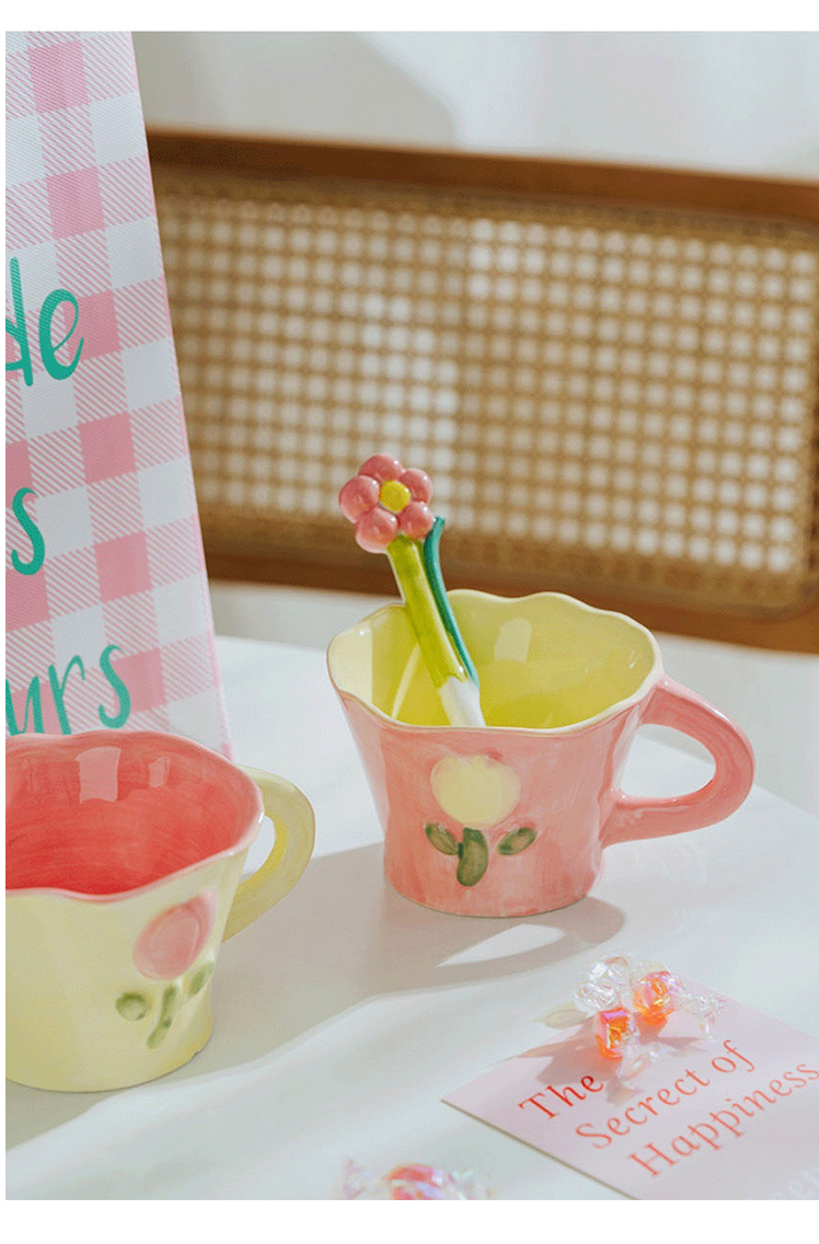 50N韩系少女心陶瓷马克杯手绘郁金香水杯咖啡杯可爱花水杯