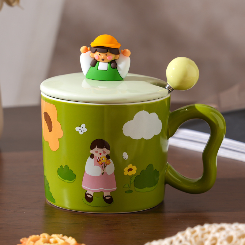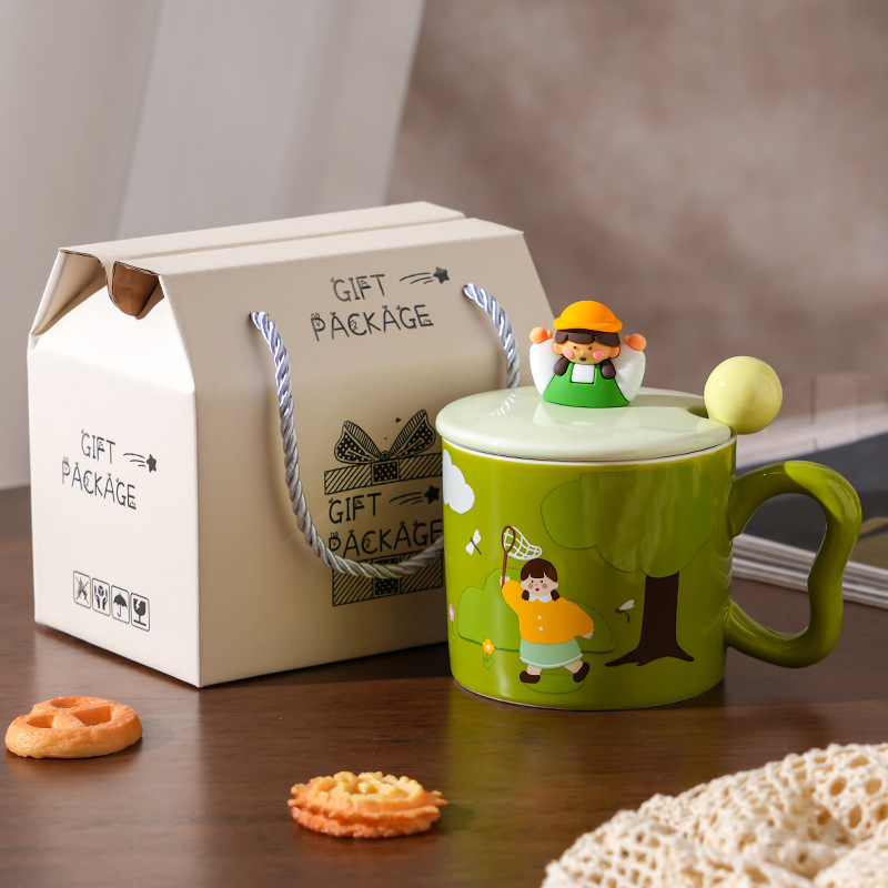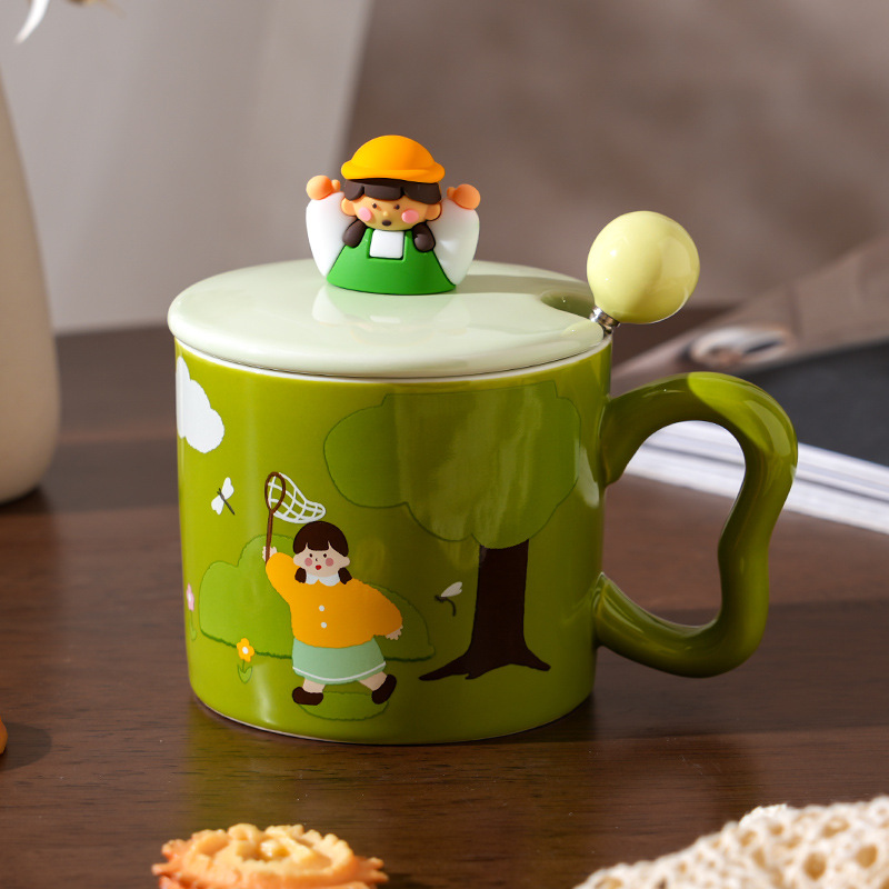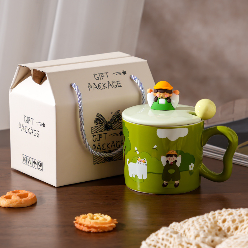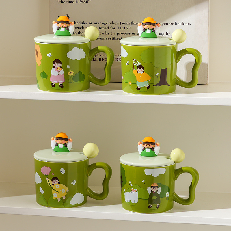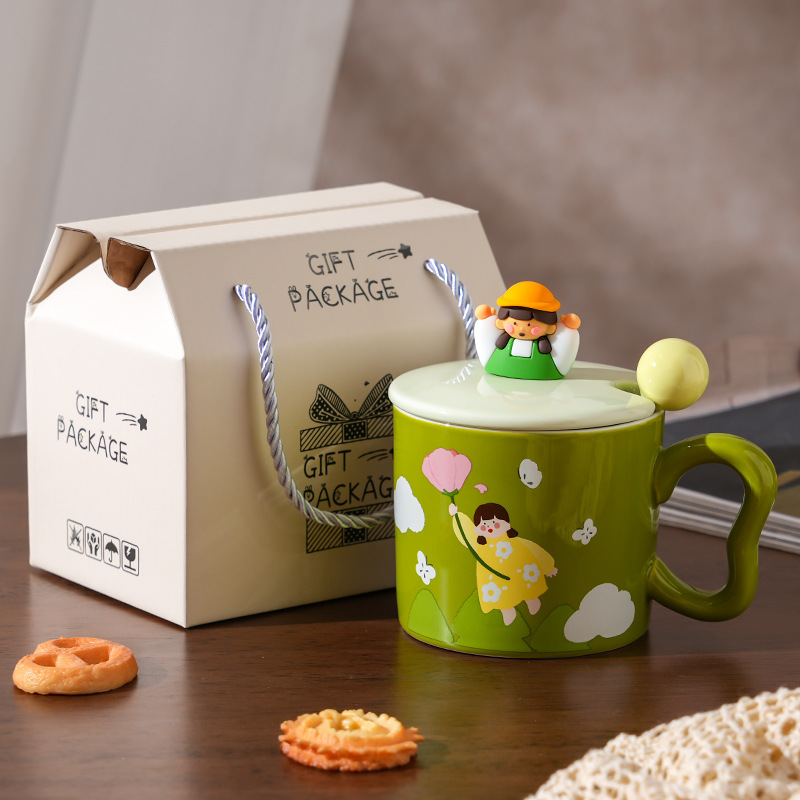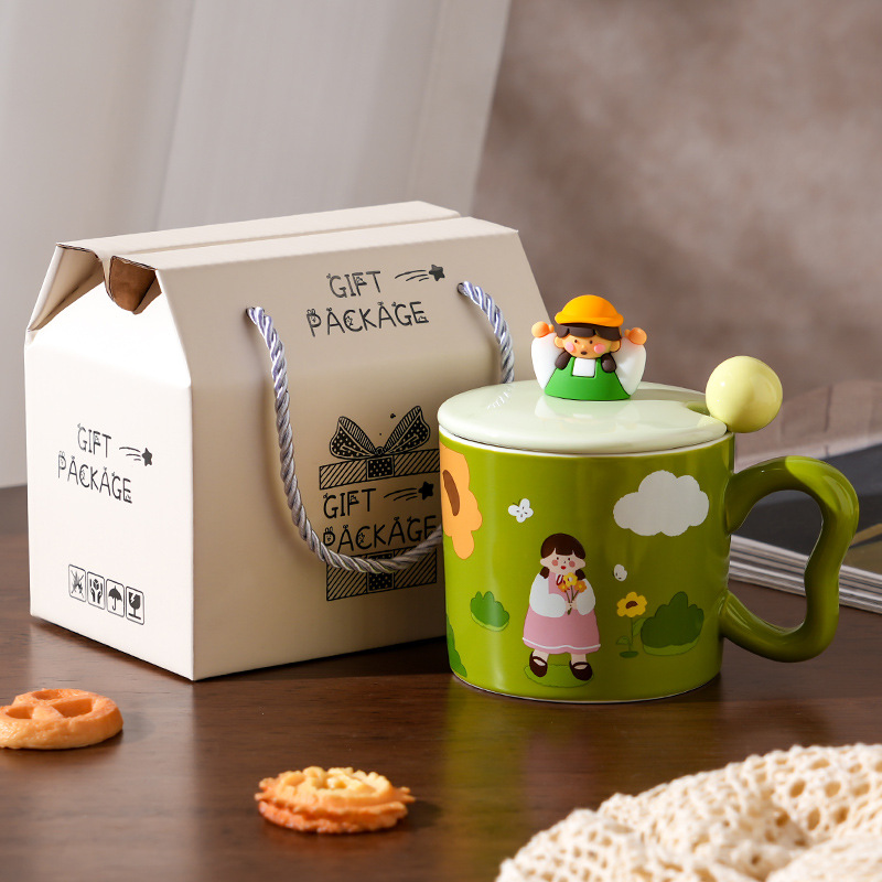 创意女孩陶瓷水杯带盖勺家用伴手礼高颜值咖啡杯简约小清新马克杯